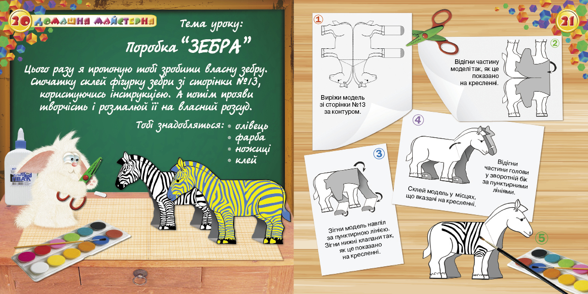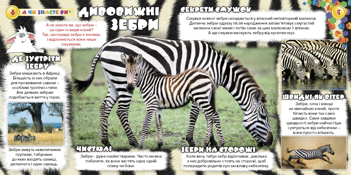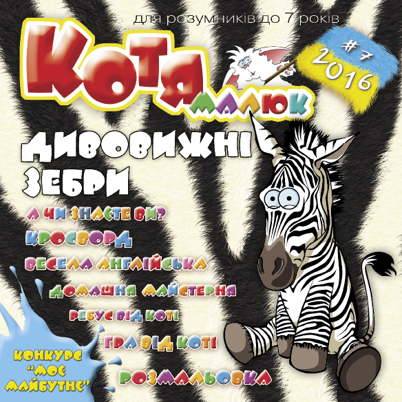 Вітаю тебе, мій любий друже! На цей раз я підготував для тебе номер присвячений дивовижним зебрам! Також я підготував для тебе  історію про те, яким чином зебри отримали свої смуги. Не забув я і про розваги: ігри, ребуси,настільну гру, симпатичну поробку, розмальовку та багато іншого цікавого. Всі рубрики ти знайдеш на звичних для себе місцях. Чекаю тебе на сторінках журналу! Твій вірний друг, Котя!