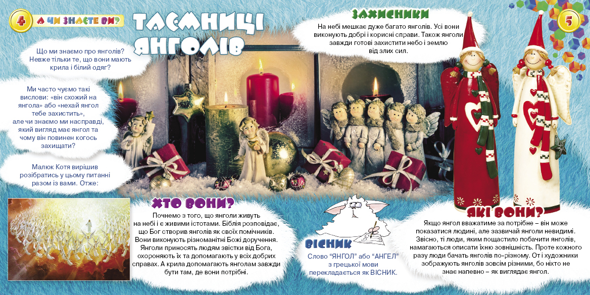 Впевнений, що тобі сподобаються розповіді про янголів. А ще ми будемо з тобою читати, писати, рахувати і мислити. Не забудемо також гарно розважитися, пограти в цікаві ігри та поринемо у захоплюючі пригоди.