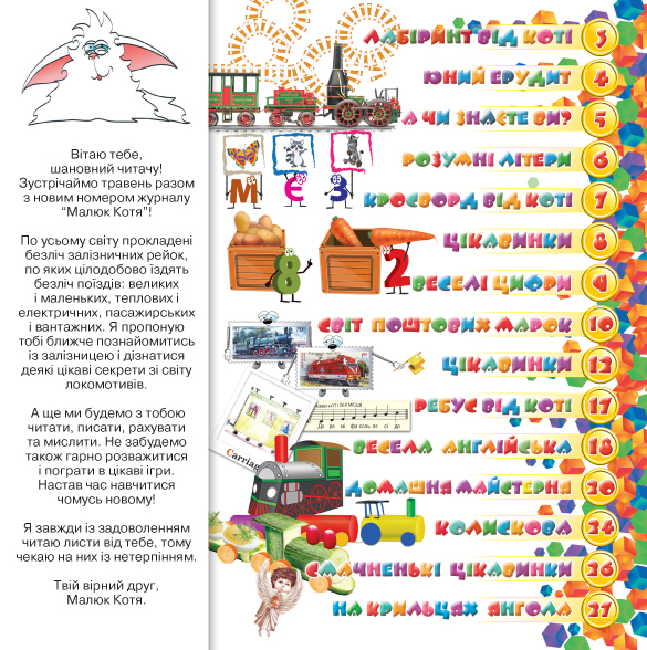 По усьому світу прокладені безліч залізничних рейок, по яких цілодобово їздять безліч поїздів: великих і маленьких, теплових і електричних, пасажирських і вантажних. Малюк Котя пропонує тобі ближче познайомитись із залізницею і дізнатися деякі цікаві секрети зі світу локомотивів.