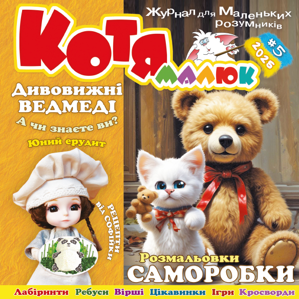і гімалайські, і малайські, тощо.  Не забудемо і про малих та великих панд. Вони волохаті, симпатичні і люблять солодощі. Так чому ж їх всі остерігаються? Відповідь на це і безліч інших питань ми знайдемо у цьому номері журналу. І, звісно, безліч різноманітних розваг: лабіринти, ребуси, розмальовки, саморобки, цікаві розповіді і веселі вірші, тощо.