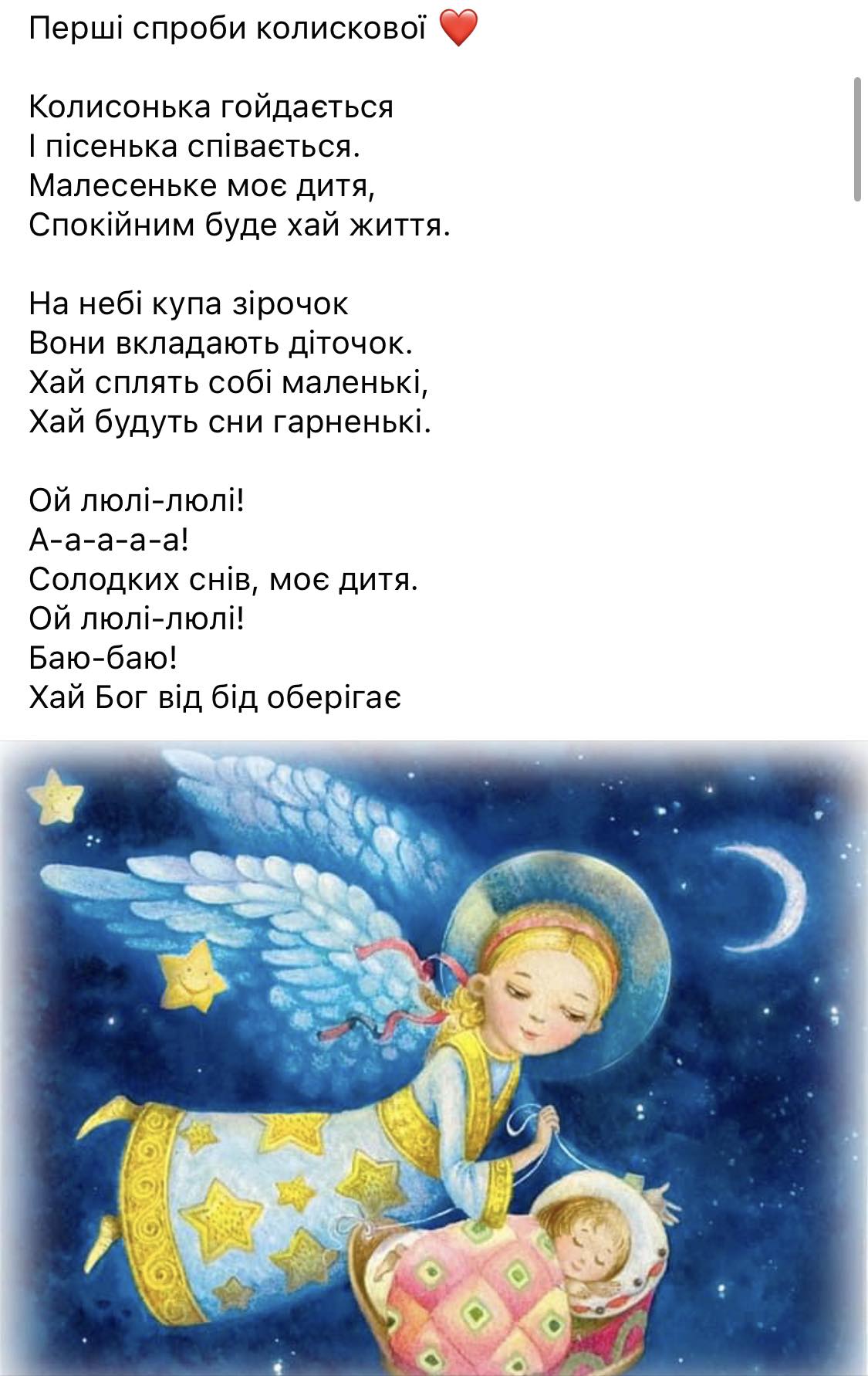Свій перший дитячий віршик написала про зимовий ліс, потім декілька колискових і розмістила їх на своїй сторінці у мережі «Фейсбук», друзям сподобалося. Так і почала писати для діток. Декілька моїх віршиків узяли для друку у журналі «Золоте Левеня». Нещодавно надіслала свої рядочки у журнал «Малюк Котя», редакція надрукувала і я цьому дуже рада. Продовжуватиму й далі писати для наши...