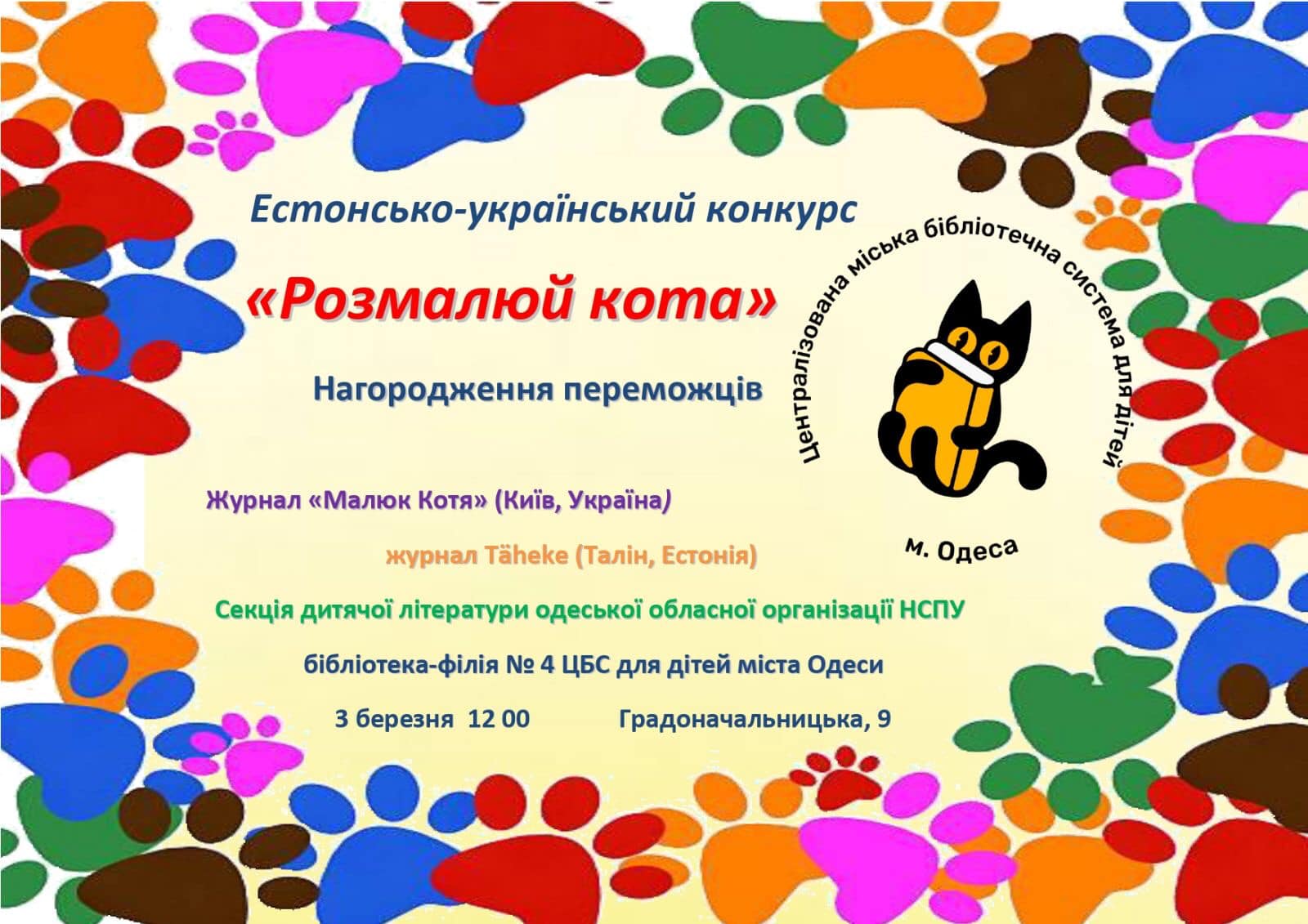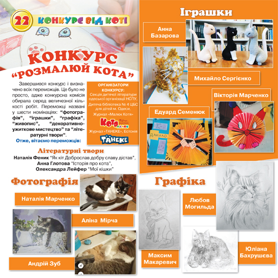 З 15 листопада 2022 року до 10 січня 2023 року тривав Міжнародний конкурс «Розмалюй кота», присвячений символу 2023 року – коту. Конкурс організовано секцією дитячої літератури одеської організації НСПУ, дитячою бібліотекою № 4 ЦБС для дітей м. Одеси, з українським журналом «Малюк Котя» та естонським журналом «TAHEKE». На конкурс приймалися ор...
