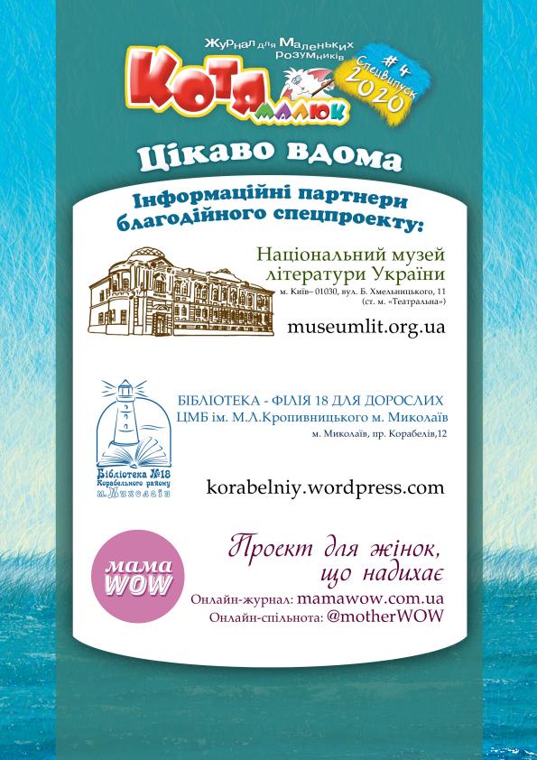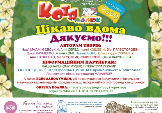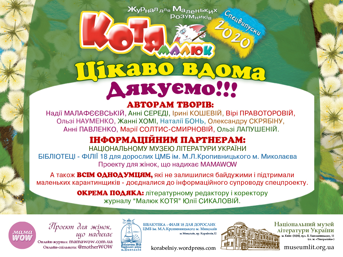 ОТЖЕ - МИ ЗАВЕРШИЛИ БЛАГОДІЙНИЙ СПЕЦПРОЕКТ «ЦІКАВО ВДОМА!» ВІД ЖУРНАЛУ «МАЛЮК КОТЯ», ЯКИЙ БУЛО СТВОРЕНО ЗАДЛЯ ПІДТРИМКИ МАЛЕНЬКИХ КАРАНТИНЩИКІВ, ЯКИМ ДОВЕЛОСЯ ВПРОЖОВЖ ВСЬОГО КАРАНТИНУ СИДІТИ ВДОМА!