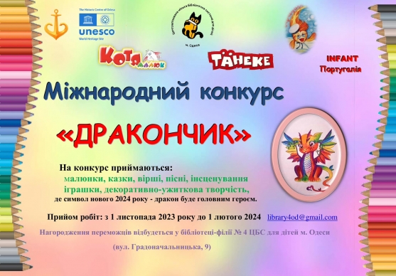 Одеса - літературне місто ЮНЕСКО, співпрацює з культурними спільнотами різних країн, популяризуючи творчість та літературу. Міжнародний конкурс покликаний розкрити таланти дітей у створенні малюнків, аплікацій, іграшок, віршів і казок, ...