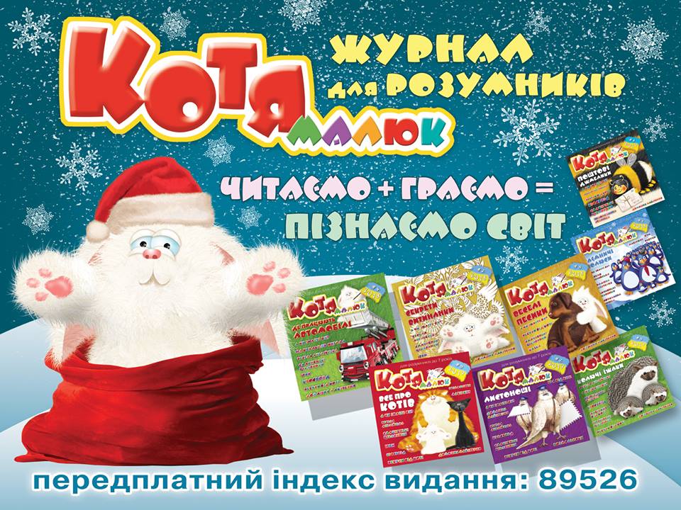 22.12.2018Передплачуйте журнал "Малюк Котя" у поштових відділеннях! Робіть передплату онлайн на сайті ДП "Преса"! А також купуйте в кіосках Союздруку міста Києва!
