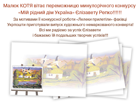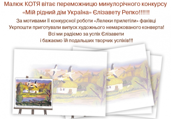 Укрпошта спільно з редакцією дитячого журналу «Малюк Котя» проводить виставку малюнків – робіт учасників конкурсу «Мій рідний дім Україна». Експозицію розміщено в великій залі Будинку зв’зку (м. Київ, вул. Хрещатик, 22).
