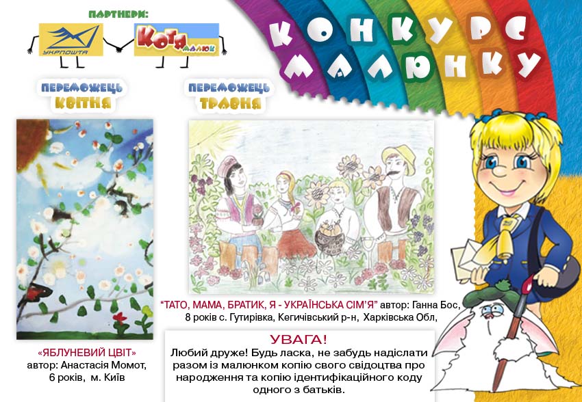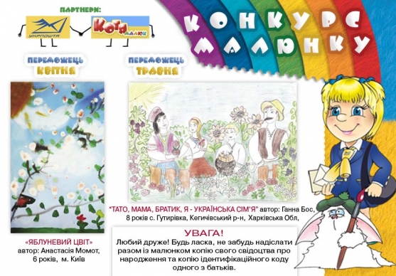 1 квітня 2015 року стартує унікальній конкурс малюнку «Мій рідний дім Україна». Конкурс для дітей дошкільного та молодшого шкільного віку започаткований дитячим журналом «Малюк КОТЯ» спільно з Українським державним підприємством поштового зв’язку «Укрпошта».